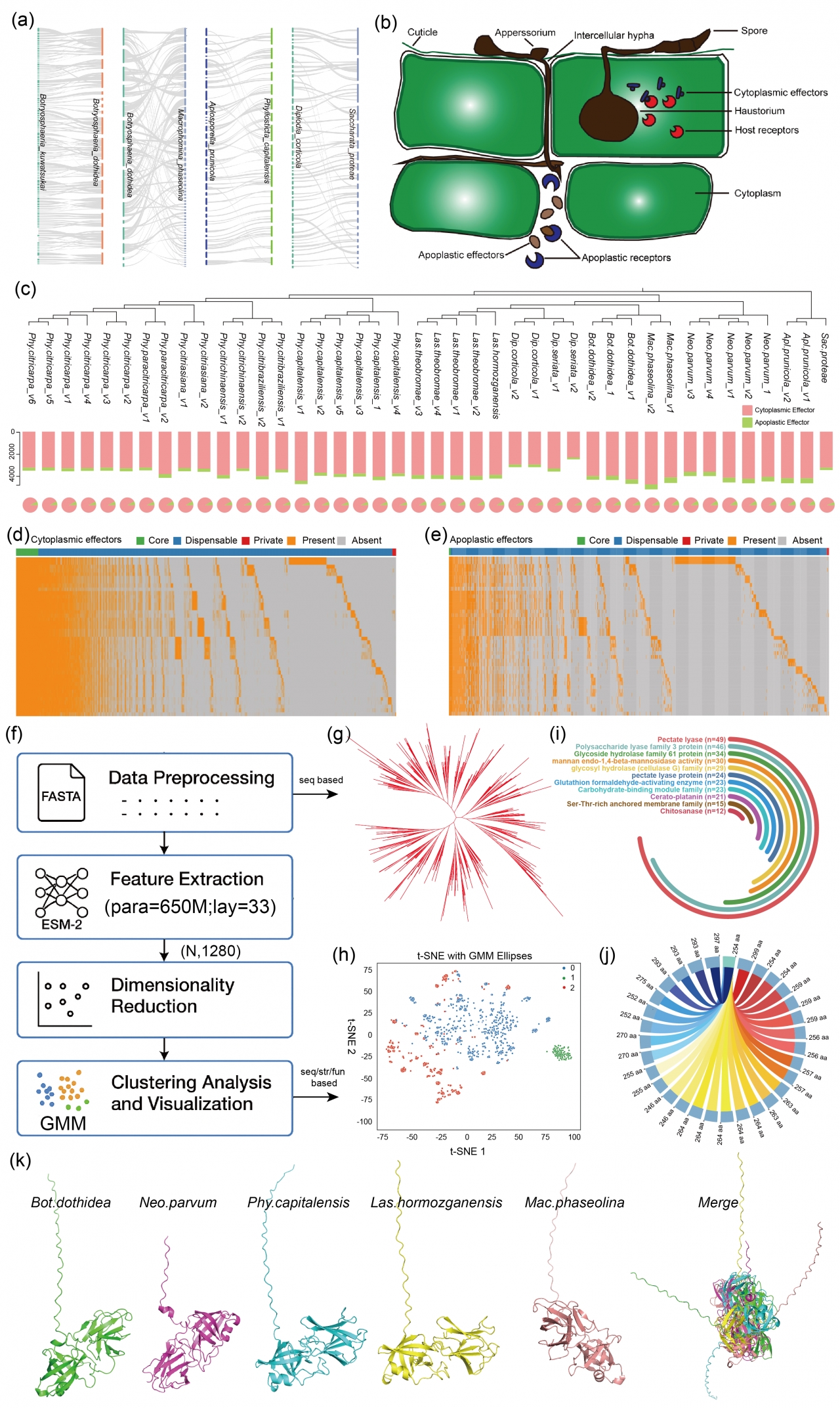 结合蛋白质语言模型ESM-2进行深度表征,并应用AlphaFold3进行高精度三维结构预测,系统解析了胞外效应蛋白的结构与功能多样性。结果发现,这些效应蛋白显著富集果胶裂解酶、甘露聚糖水解酶等植物细胞壁降解酶类,直接参与宿主组织的侵染与定殖过程。值得注意的是,同一类效应蛋白在不同属间呈现出剧烈的三维结构差异,提示其在进化过程中经历了深层次的结构重塑与适应性分化(图5)。