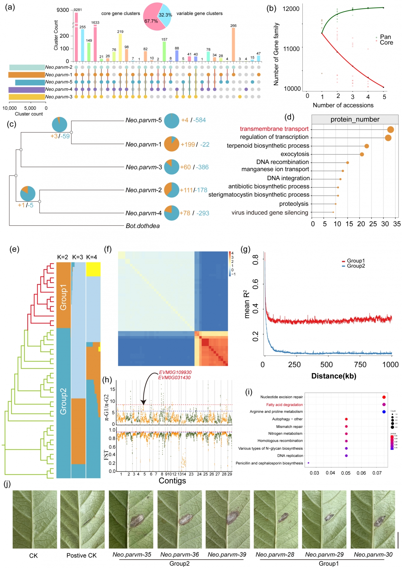 研究团队基于多个自然菌株的全基因组重测序数据,结合泛基因组与群体遗传分析发现与致病性、环境适应性及代谢物合成相关的基因在不同亚群中受到显著选择压力。这些选择信号构成了亚群分化的遗传基础,并可能直接导致其在致病性强弱、胁迫耐受能力等生态功能上的差异(图3)。